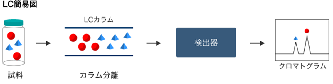 試料を移動相(液体)とともに固定相(カラム)の中に流し、固定相の相互作用(吸着・分配・イオン交換・サイズ排除など)によって分離する方法です。(参考:クロマトグラフィー分析法の原理)